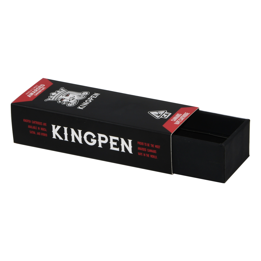 This sleeve drawer box is used for vape pen packaging for Loudpack. The inner drawer box is made from 1200 GSM rigid paperboard, the outer sleeve box is made from 325 GSM cardboard. The main printing method is offset printing, and the matte lamination on surface is very useful to protect the box from bumps and scratches. The dimension of this box is 8*3*1 cm. We also can customize any details for our customers if they are interested in this box shape.